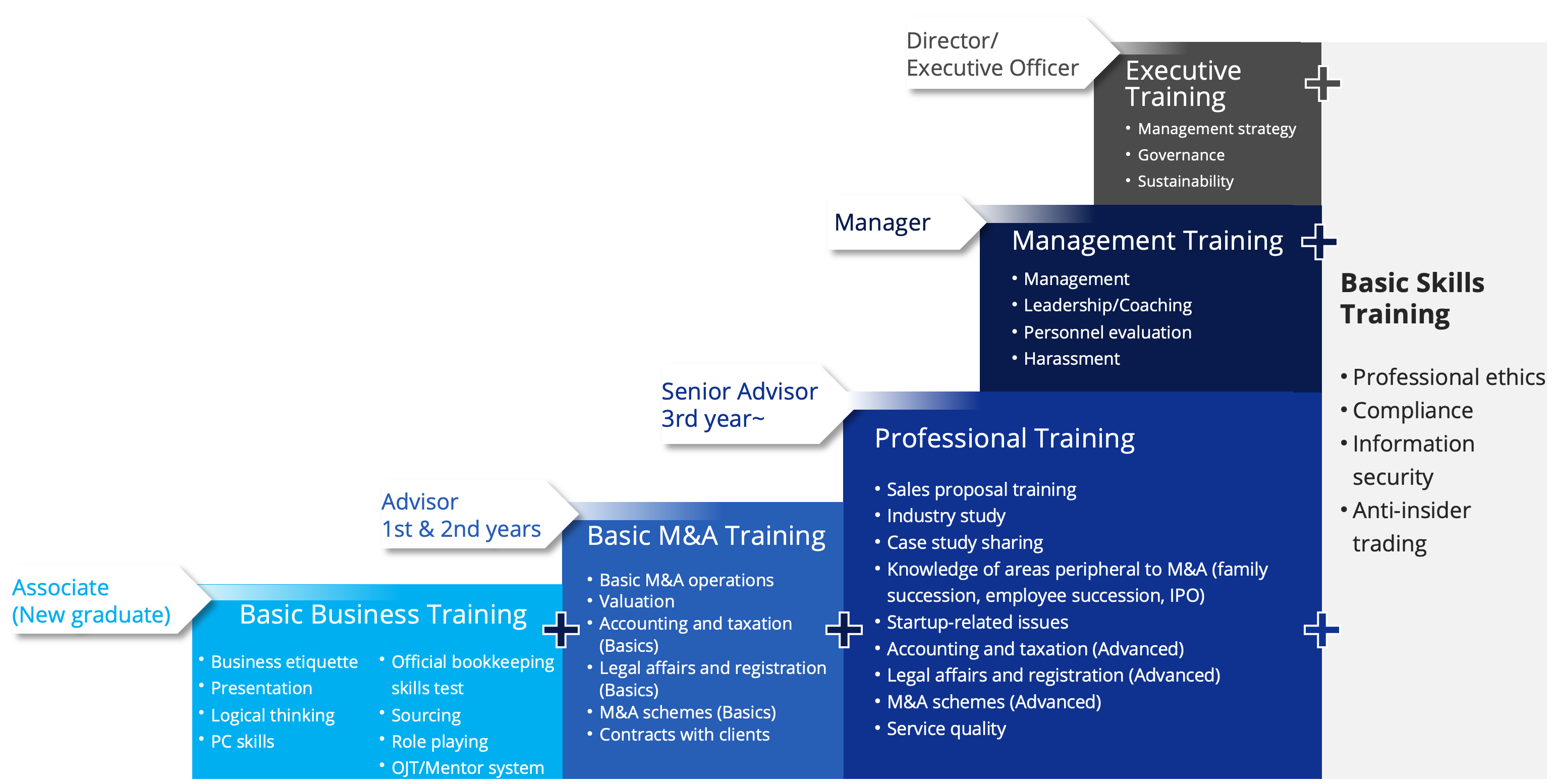 | Practical M&A training | Training on M&A-related accounting, tax, and legal matters provided by in-house CPAs, tax accountants, lawyers, judicial scriveners, and labor and social security attorneys, etc. | Consultants |